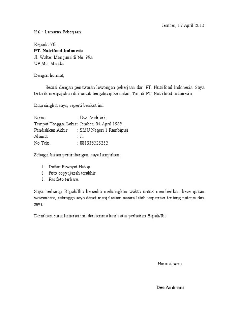 Sederhana yang penulis maksud ialah sebuah surat yang ditulis secara singkat, padat dan jelas. Ciri ciri surat lamaran pekerjaan untuk melamar kerja pada . Berikut ini adalah data singkat saya : Contoh surat lamaran kerja yang baik dan benar, dijamin lolos seleksi hrd. Menggunakan kalimat yang singkat padat sopan dan jelas.